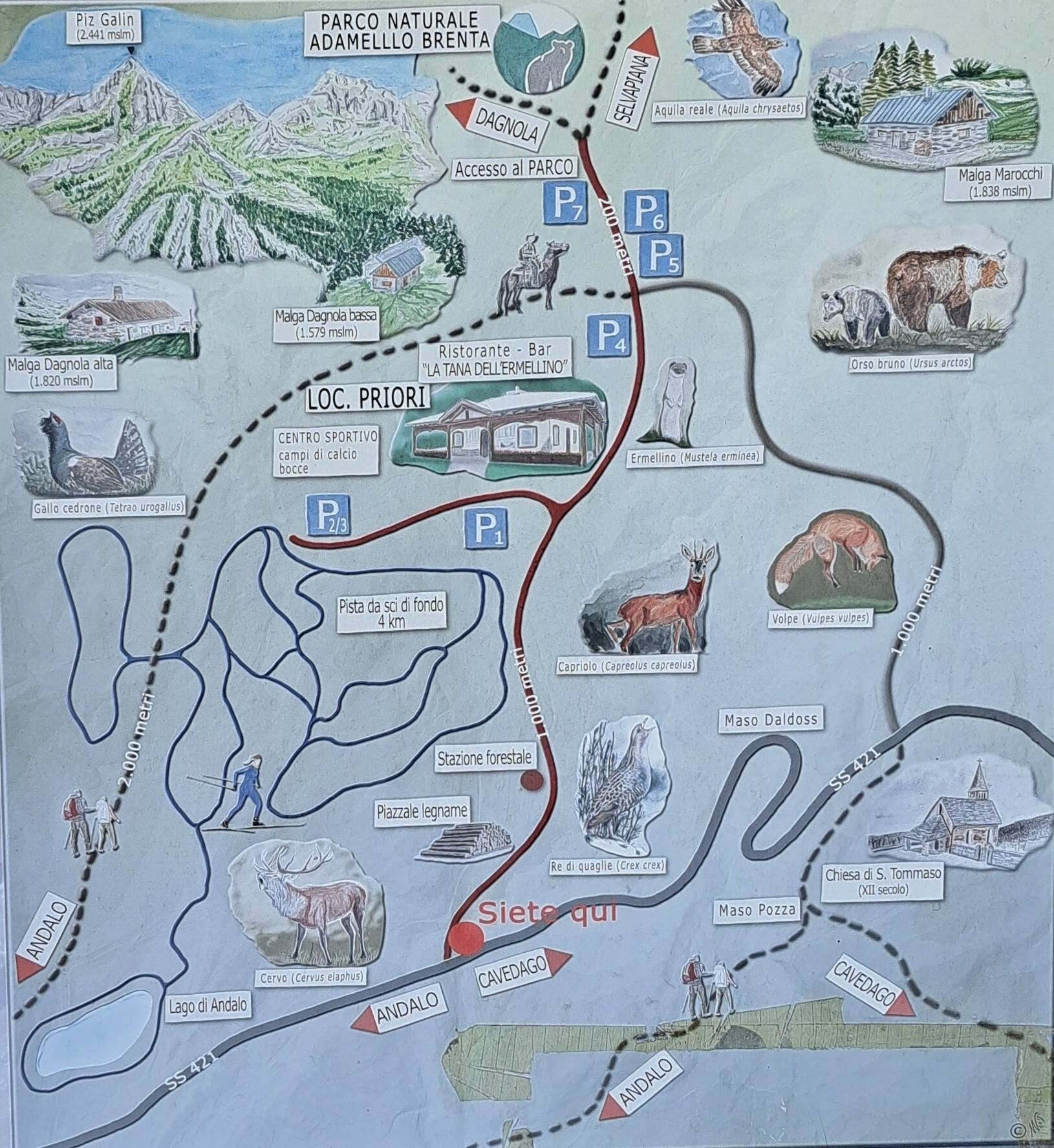 Un tempo in questa zona pascolavano mucche, pecore e capre. Oggi è verdeggiante di boschi di conifere(pino silvestre, abeti) e di faggi. Da qui partono numerosi escursioni attraverso il Parco Naturale Adamello Brenta, che portano alle malghe di Cavedago: Dagnola bassa, alta e Marocchi; alle cime del Brenta ed in particolare alla Cima del Piz Galin. Dall’ “Osservatorio Faunistico”(a circa 500 mt. dall’entrata nel parco PNAB) è possibile vedere oltre al panorama su parte della Val di Non e Valle dello Sporeggio, caprioli, cervi, lepri e guardando verso il cielo scorgere poiane, falchi e qualche volta anche l’aquila.